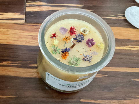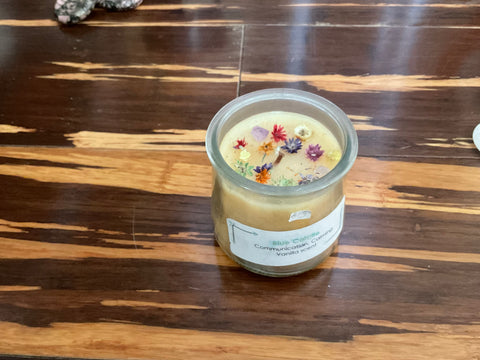 New Vanilla scented crystal candle in glass jar. 8 oz. Blue Calcite chips on inside with Sinvata flowers on top.
