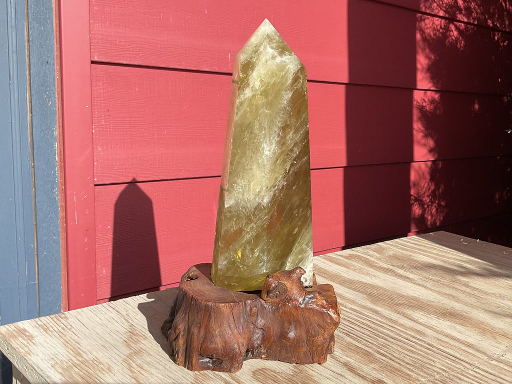 Natural polished Citrine point on wood base