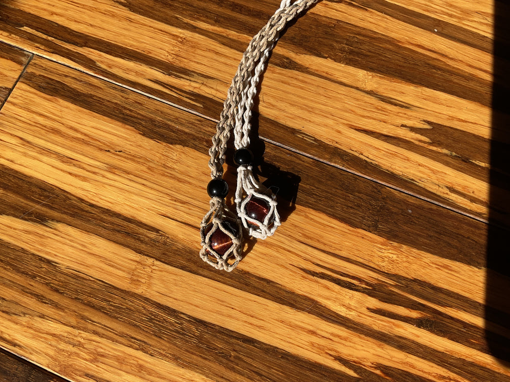 Polished Falcon's Eye or red Tiger's Eye marble in cage necklace